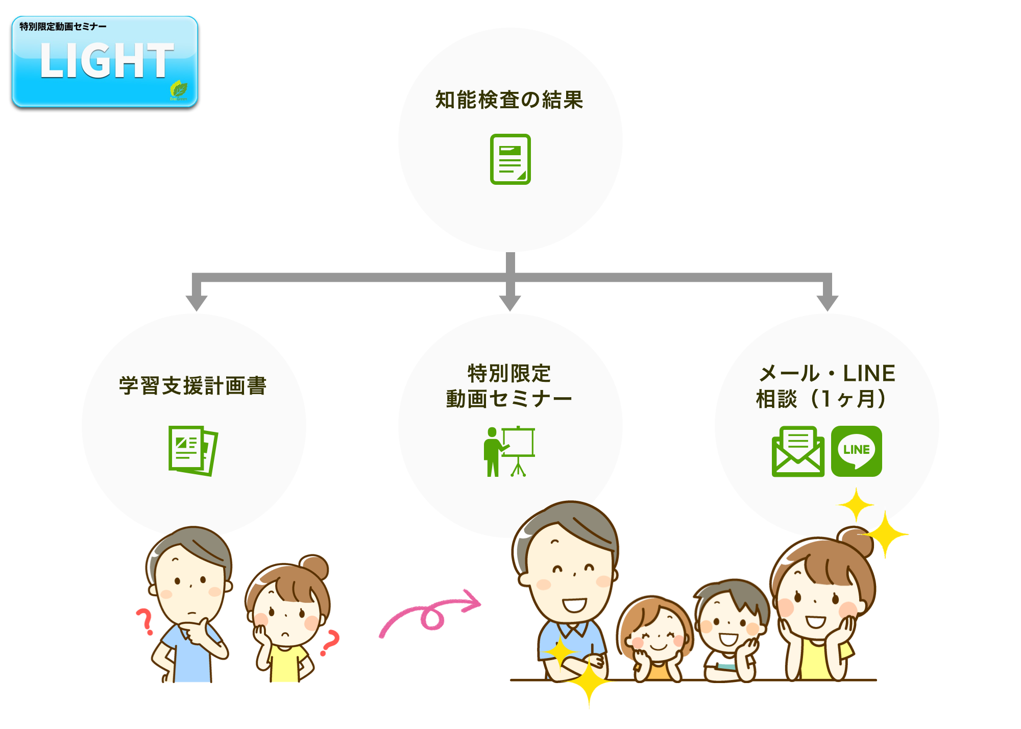 動画セミナーには、①知能検査(WISC)の結果を踏まえた個別の学習支援計画書の作成(1回)、②特別限定動画セミナー視聴、③メール・LINEによる個別相談(1ヶ月)、という3つのサービスが含まれています。
